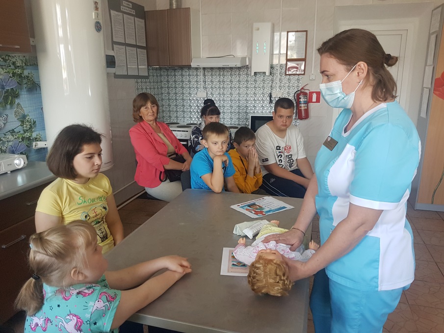 Медицинская сестра Фендель О.Н. показала детям на практике, как оказать первую помощь человеку, если он перегрелся на солнышке, порезался, наглотался воды во время купания, как быстро позвать на помощь взрослых и вызвать скорую помощь.
