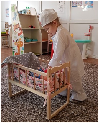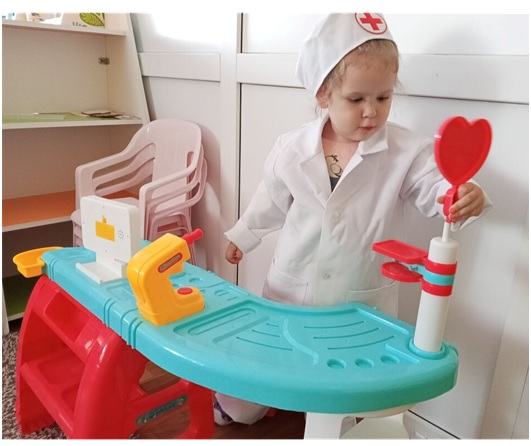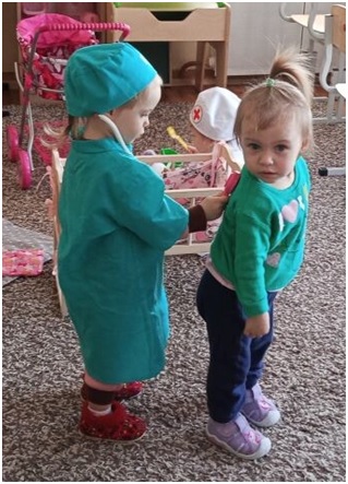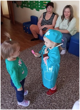 Мероприятие прошло в уютной комнате «Детской самореализации», которая на время превратилась в настоящую детскую поликлинику. Малыши с восторгом примерили на себя роли медицинских работников: они облачились в одежду врачей и аптекарей, чтобы лечить своих самых первых пациентов – любимых кукол и, конечно же, мам.
